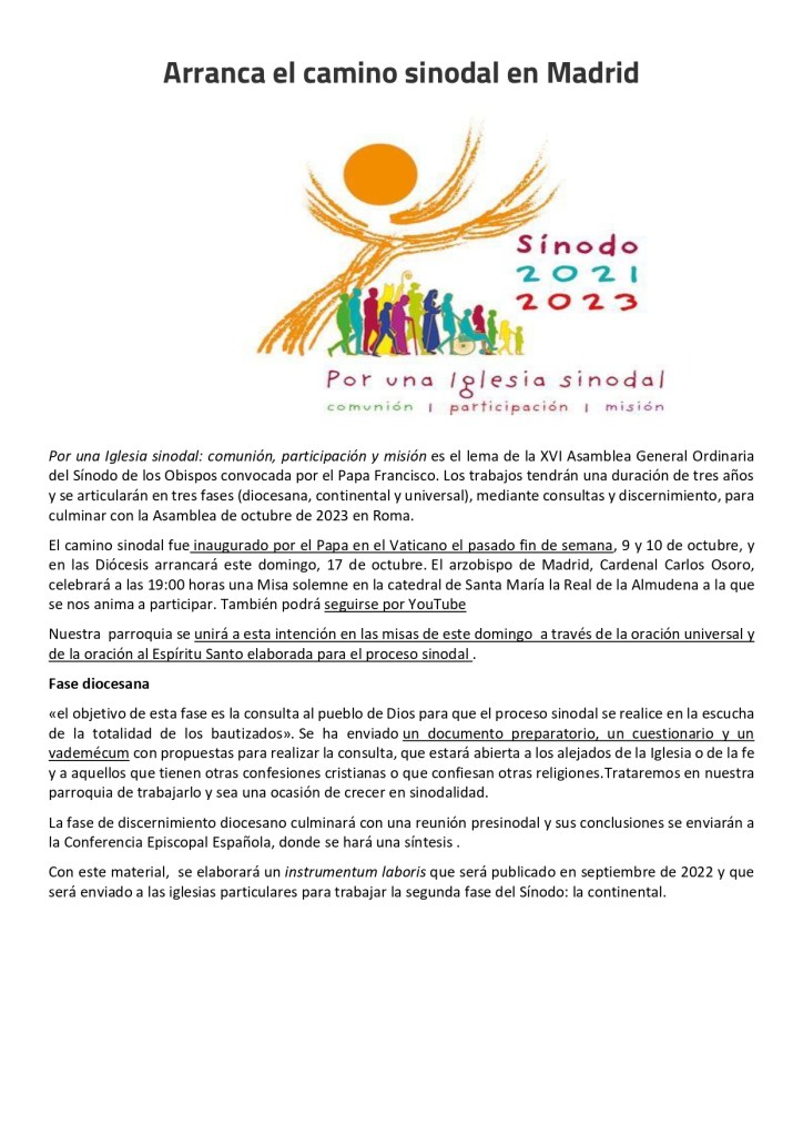 Hora: 8 mañana (Oratorio abierto desde las 7,30). Acabará antes de las 8,30
