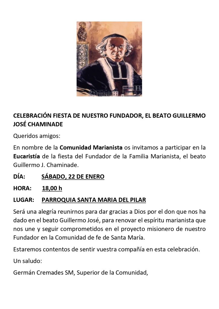 Mañana sábado, a las 18h, emitiremos en directo a través de nuestro canal de YouTube, la Eucaristía que celebraremos en Santa María del Pilar en el día del fundador de la Compañía de María, el beato Guillermo José Chaminade.